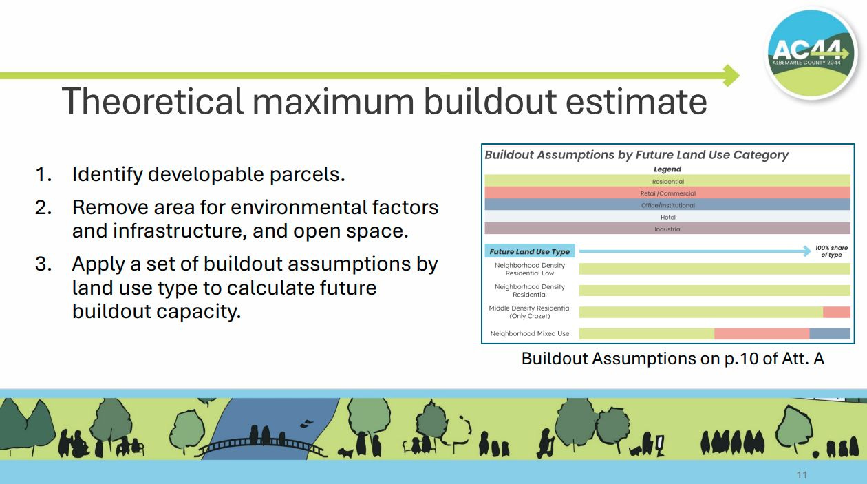 At the beginning of the AC44 process in 2022, Albemarle hired the firm Kimley-Horn to come up with a baseline of how efficiently the county is using that land. The company looked at all developable parcels of land greater than two acres and reviewed recent rezonings. Albemarle then hired the firm Line and Grade in 2025 to update the data based on what was known in the development pipeline as of April 1 of this year.