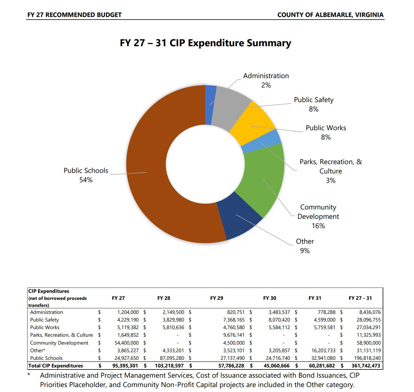 The capital improvement plan for FY27 is recommended at $95,395,301 with $54.4 million slated for spending in the “community development” category. The bulk of that, or $40.8 million, is slated for the extension of Boulders Road at Rivanna Futures. At least half of that amount comes from the Commonwealth of Virginia. Albemarle will need to incur $8.8 million in debt for its share of the project.