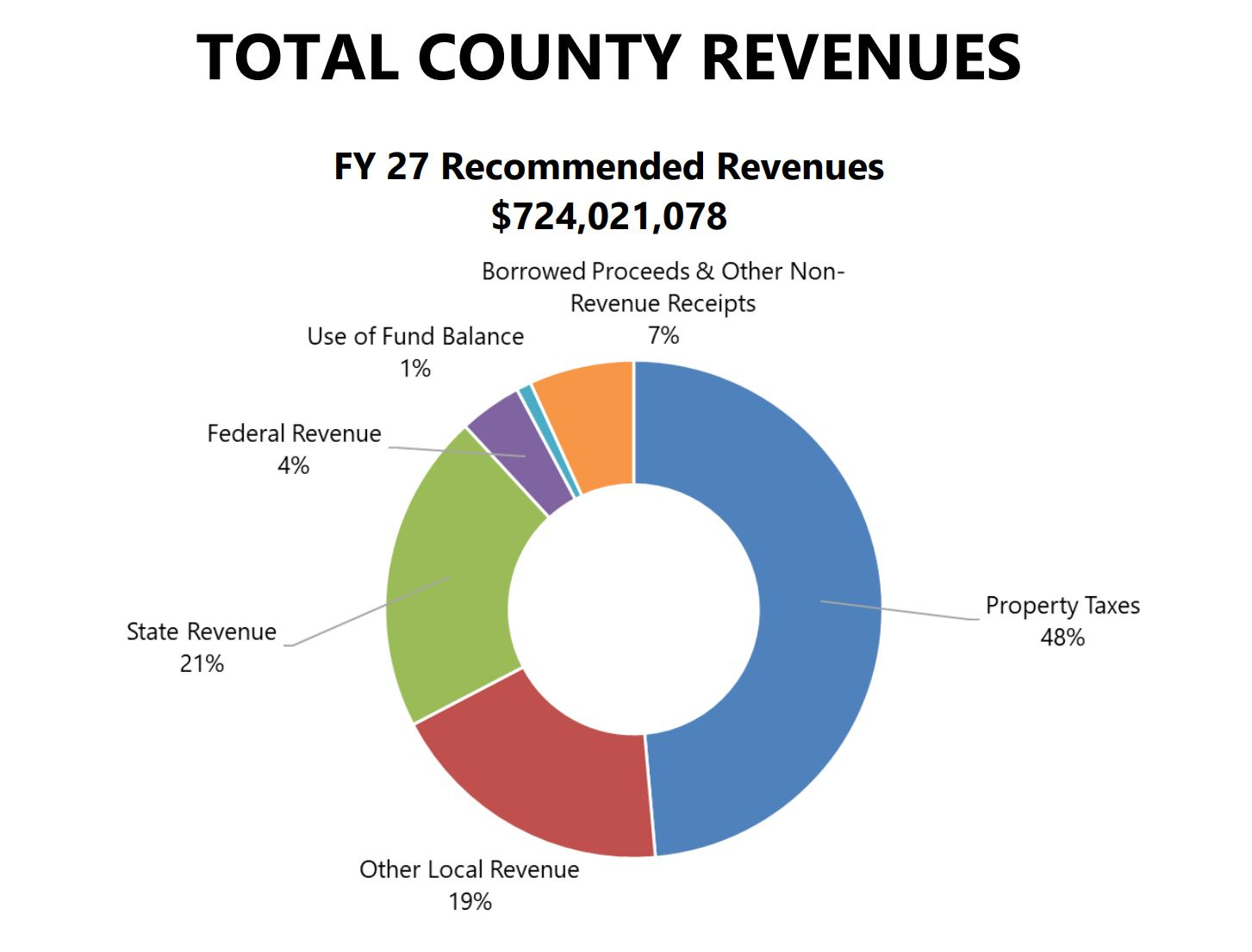 Albemarle brought in $307,736,723 in property taxes in FY25 and is anticipated to bring in $323,769,578 in FY26. That includes both real property as well as personal property. For FY27, Albemarle is projecting a collection of nearly $352 million, or 48 percent of the total budget.