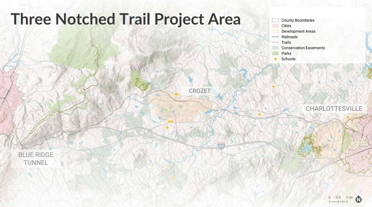 The Rivanna Trail Foundation and others have had the idea of building a shared-use path between Charlottesville and Crozet along a pathway that dates back to colonial times. In 2022, the U.S. Department of Transportation awarded Albemarle County $2 million for a planning study to come up with alternatives for a Three Notched Trail that would extend to the Blue Ridge Tunnel.