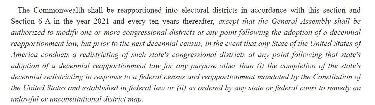 The Virginia General Assembly adopts a Constitutional Amendment allowing for a retaliatory Congressional Redistricting if any other U.S. State makes the attempt
