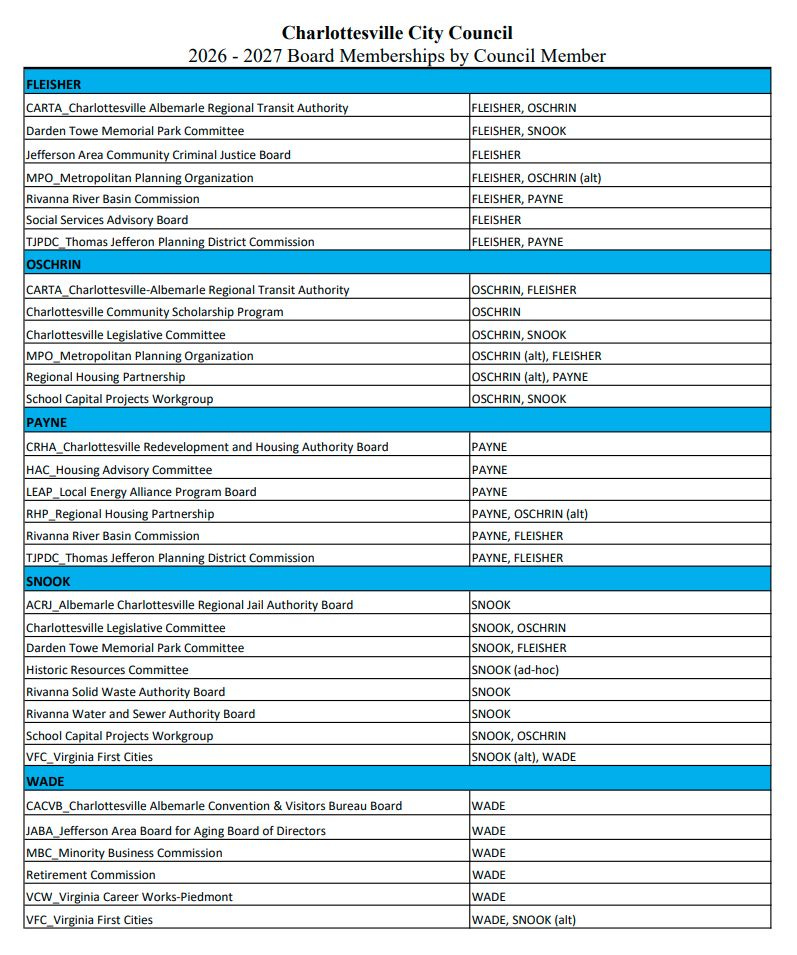 The appearance of a new member of the Charlottesville City Council presents an opportunity for the five elected officials to potentially select new boards and commissions they might want to serve on.