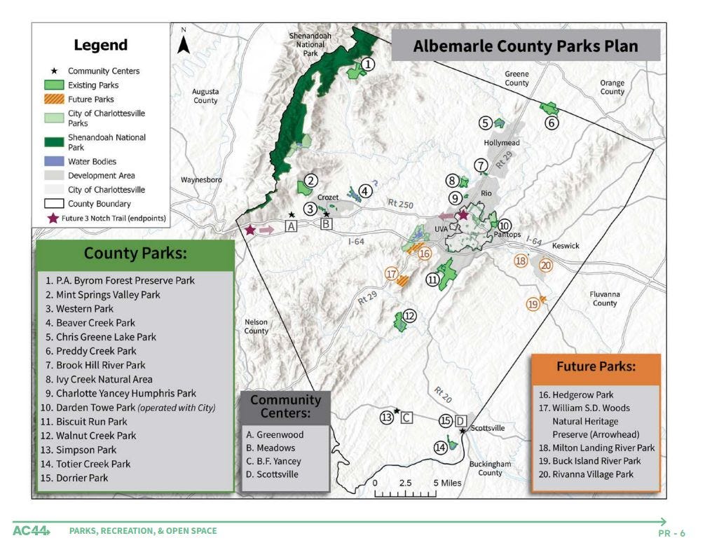 Smith helped lead a parks and recreation needs assessment for Albemarle in 2018 and creation of a parks strategic plan. Much of that is now within the Parks and Recreation Chapter of AC44, the name the county called their Comprehensive Plan. This link will take you right there.