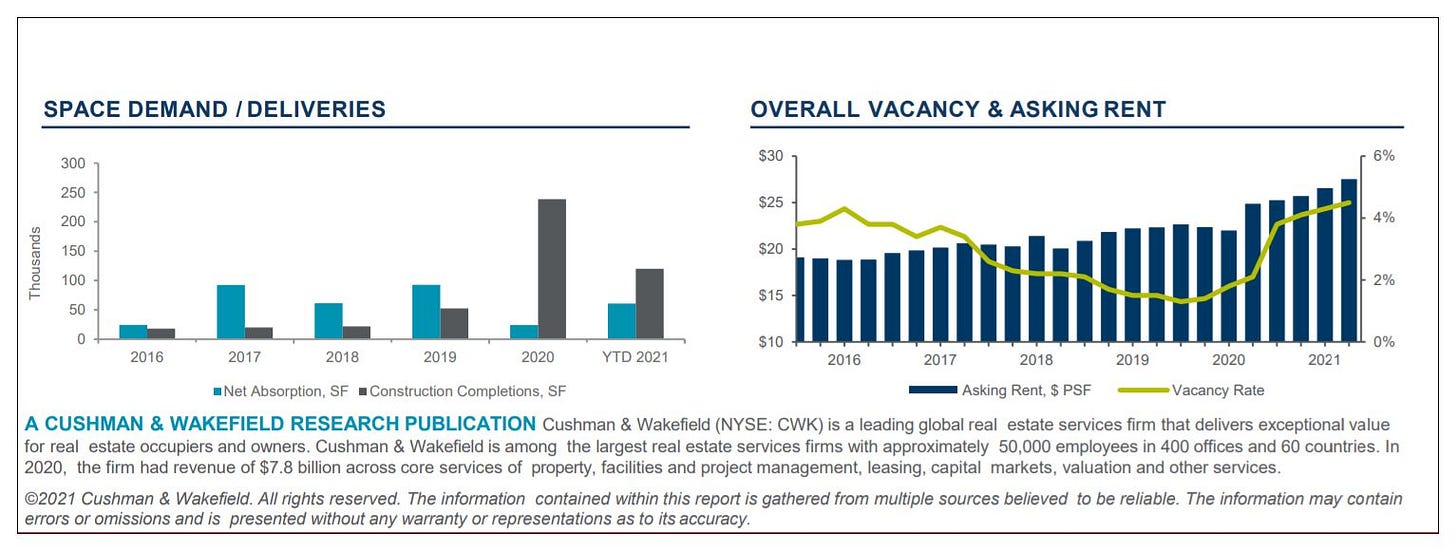 “Absorbency in the market was down for the quarter but that is more a reflection of large new deliveries than lack of demand and remains net positive for the past 12 months,” reads the report. “In fact, 87 percent of the nearly 380,000 square feet of office space under construction is already pre-leased and since Q1 2020 there has been more space delivered than in prior decades.”
