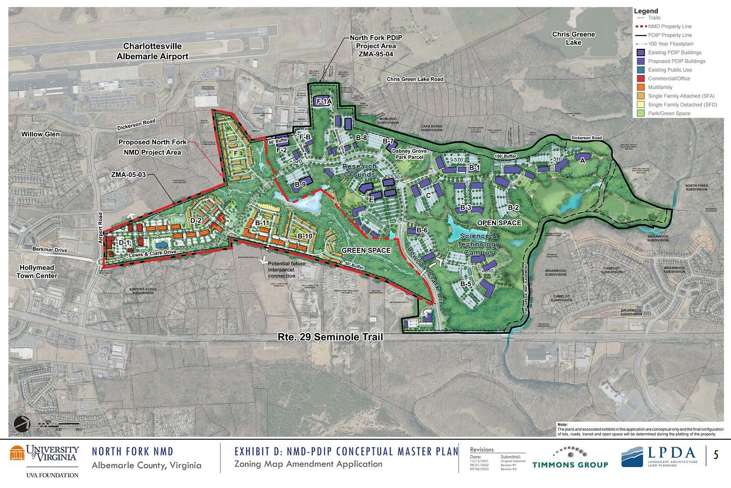 “ZMA202100016 is a proposal for a request to rezone the southern area of the North Fork UVA Discovery Park to NMD, Neighborhood Model Development, to allow residential uses, approximately 1,400 units,” reads an October 6 letter sent to adjacent property owners.
