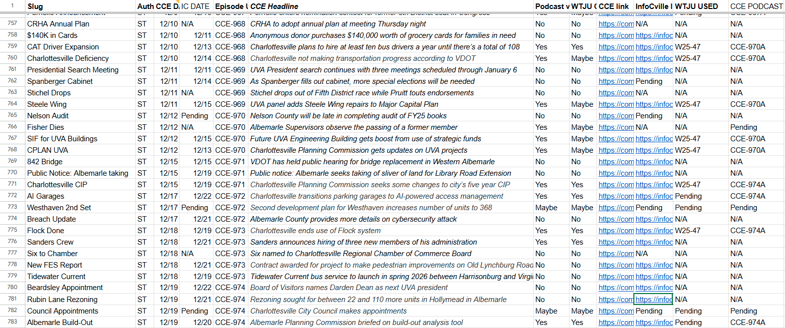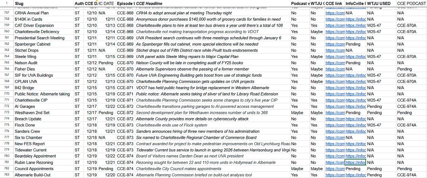December 22, 2025 has arrived and so has this sonic edition of Charlottesville Community Engagement. Many of the longer versions of stories are produced as if they are going to air on the radio, and for this edition two have already done so! The other two have not, but will be among the stories that may be chosen for the December 27 edition that will air on WTJU at 6 a.m. Between now and then the goal is to spend the holiday period combing through a backlog of potential topics. I’m Sean Tubbs, and I’m glad that this is what I do.
