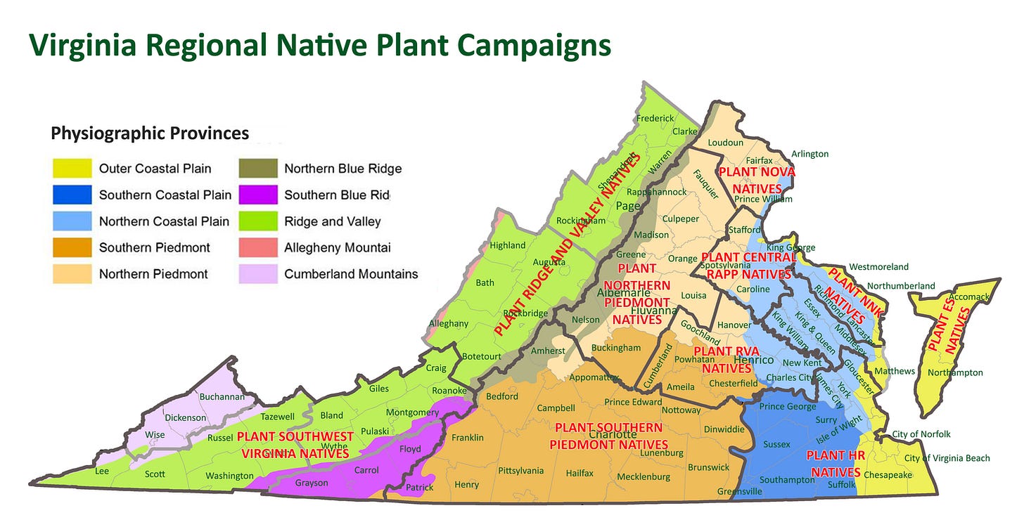 One resource I could consult is Plant Virginia Natives to figure my way out of my predicament. Plant Virginia Natives is part of a partnership with ten regional campaigns for ten different ecosystems across Virginia, from the Northern Piedmont to the Eastern Shore. Take a look at the full map below for the campaign for native species where you are in the Commonwealth. For the Charlottesville area, download a free copy of the handbook: Piedmont Native Plants: A Guide for Landscapes and Gardens.