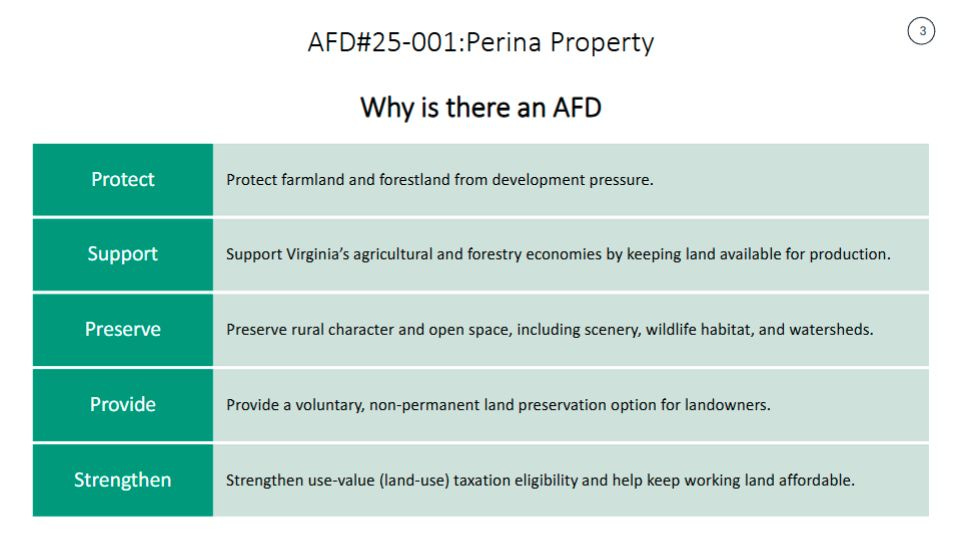 There will be a public hearing on a request to add an 81.51 acre parcel on Welsh Run Road to the James Agricultural and Forestal District.