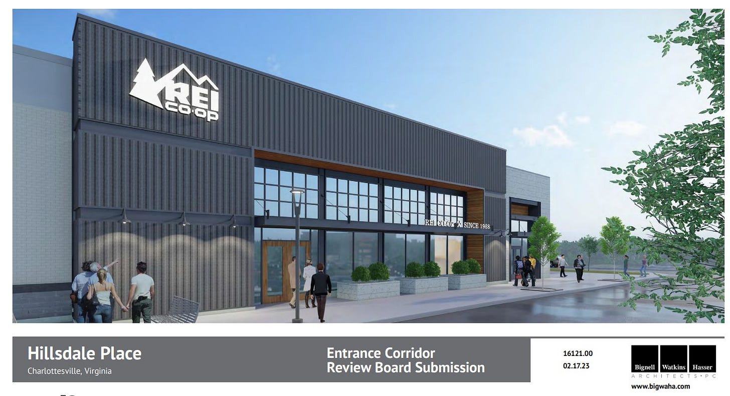 On the consent agenda is an Entrance Corridor Review Board of Hillsdale Place. That’s the name for Riverbend Development’s proposed redevelopment of the former K-Mart Plaza. The materials now show an REI Co-Op in the position, but is that accurate or just a place-holder?