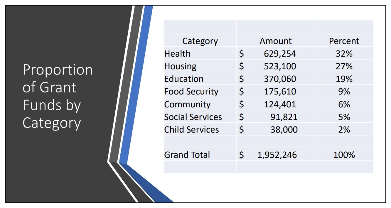 Recent examples include COVID-19 vaccinations for migrant farm workers, a new gymnasium at the Nelson Heritage Center, and food supplements for school children.