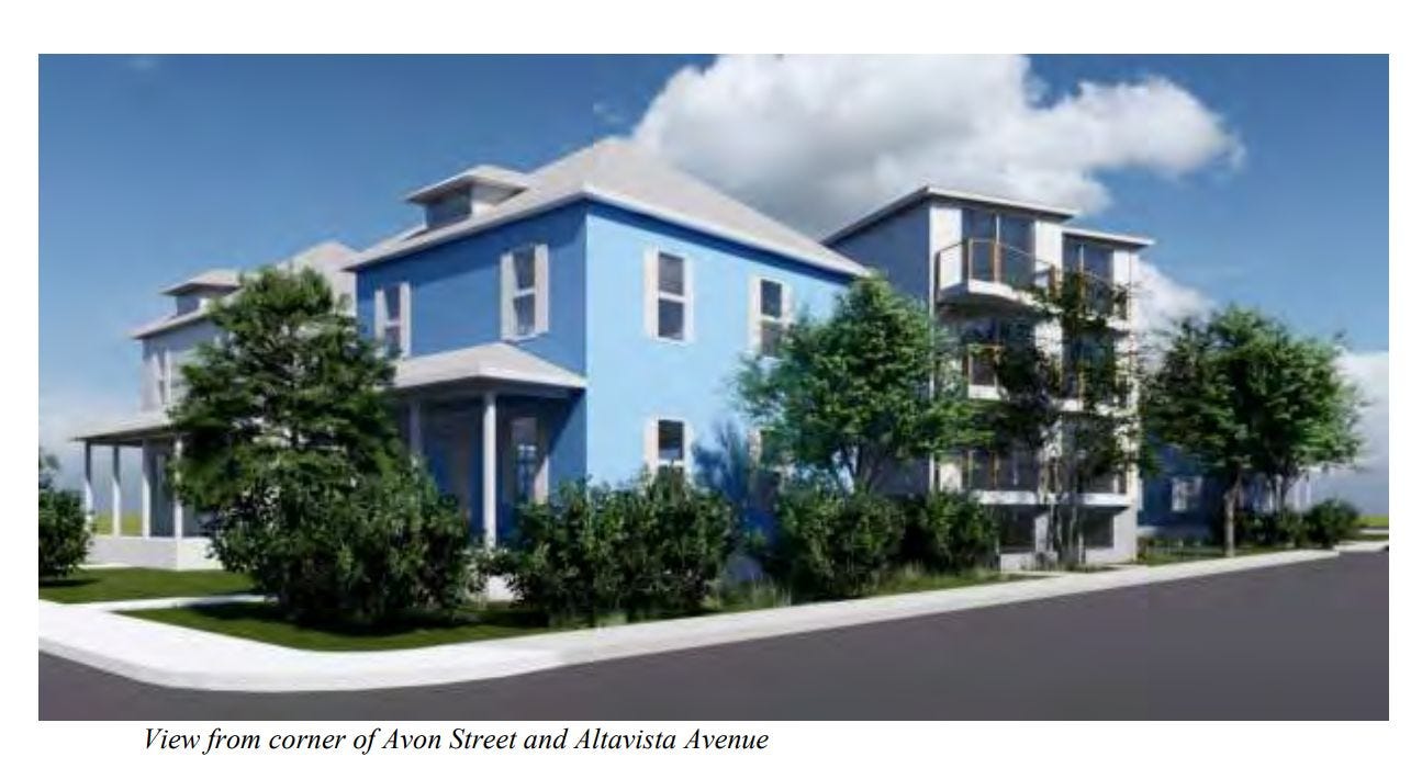 The first is for a rezoning and special use permit for 1120 Avon Street. The property is owned by developer Nicole Scro who is also serving as manager for Chicken Oriented Development LLC, the applicant. The request is to rezone the 0.148 acres from R-1S to B-2 and receive a permit to allow up to 10 units with one designated as “affordable” for a period of 99 years. The staff report describes what would be possible under the future zoning of Residential-C.