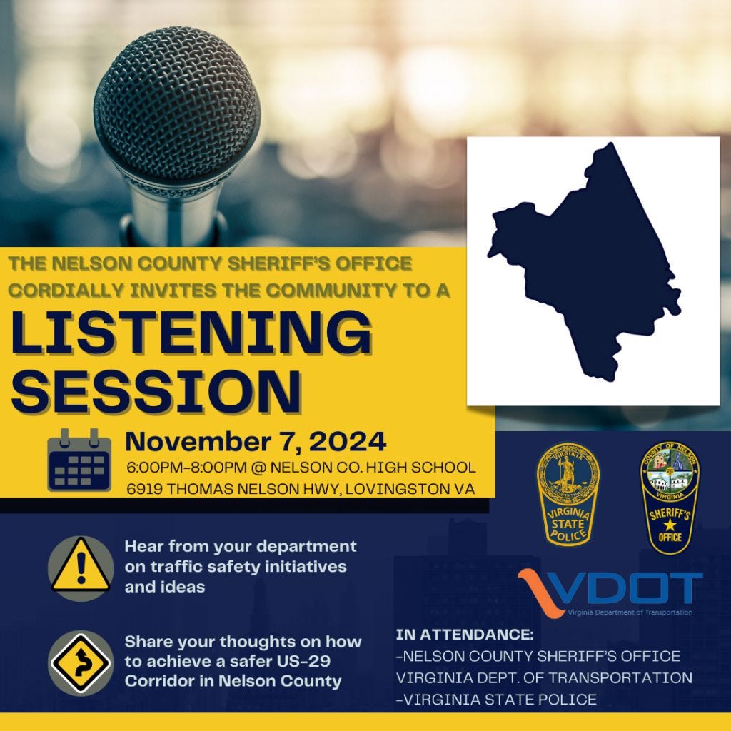 Another will be held this Thursday when Embry holds a listening session at the Nelson County High School from 6 p.m. to 8 p.m. In attendance will be representatives from the Virginia Department of Transportation and the Virginia State Police.